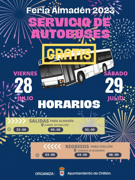 Los días 28 y 29 de julio contaremos con servicio de autobuses para ir a la feria de Almadén. Los horarios puedes verlos en el cartel.
