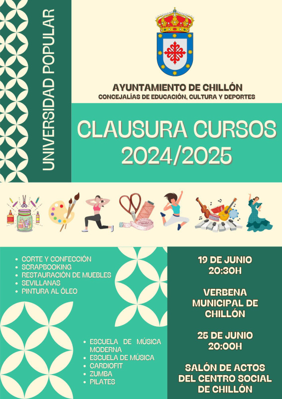 El próximo jueves, 19 de junio y el miércoles, 25 de junio, pondremos el broche final a los Cursos de la Universidad Popular 2024-2025. Para ello, celebraremos los actos de clausura con todos los/as profesores/as y alumnado de los diferentes cursos impartidos durante este año escolar.