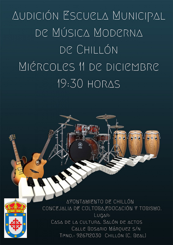 Anímate y asiste a la audición de los alumnos de la escuela de música moderna de Chillón el próximo miércoles 11 de diciembre a las 19:30 horas, en el Salón de Actos de la Casa de cultura.