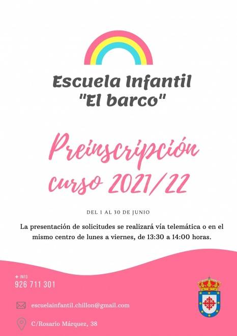 Se abre el plazo para la presentación de solicitudes para el nuevo curso escolar 2021/2022 en la Escuela Infantil "El Barco" de Chillón.
