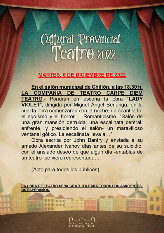 El martes día 6 de diciembre, en el salón municipal de Chillón, a las 18:30 h,, la compañía de teatro "Carpen Diem Teatro" pondrán en escena la obra "Lady Violet", dirigida por Miguel Ángel Berlanga.