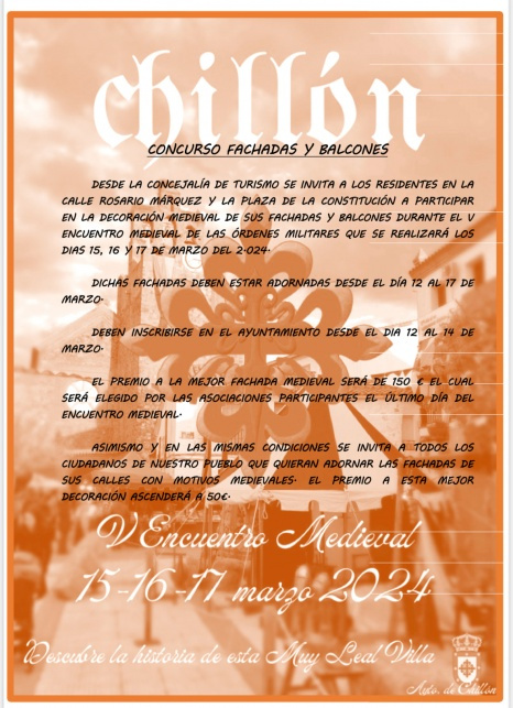 Desde la Concejalía de Turismo se invita a los residentes de la calle Rosario Márquez y la Plaza de la Constitución a participar en la decoración medieval de las Órdenes Militares que se realizará los día 15, 16 y 17 de marzo del 2024.
