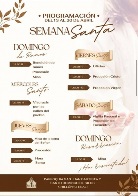Desde el Ayuntamiento de Chillón compartimos los horarios de los actos litúrgicos y procesionales de la Semana Santa 2025, organizados por la Parroquia San Juan Bautista y Santo Domingo de Silos.