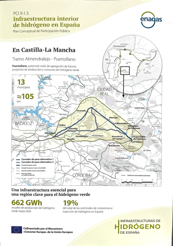 Desde el Ayuntamiento de Chillón queremos informaros de que nuestro municipio aparece en el mapa de la futura red troncal de hidrógeno en España, un ambicioso proyecto impulsado por Enagás, con el respaldo del Gobierno de España, la Junta de Comunidades de Castilla-La Mancha y cofinanciado por la Unión Europea a través del mecanismo “Conectar Europa”.