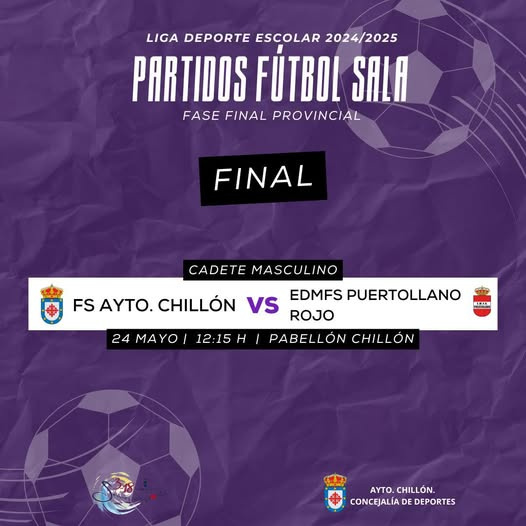 Este sábado 24 de mayo a las 12:15 h, nuestro equipo FS Ayto. Chillón se juega la final provincial de fútbol sala cadete masculino frente a EDMFS Puertollano Rojo… ¡Y lo hace en nuestro pabellón!