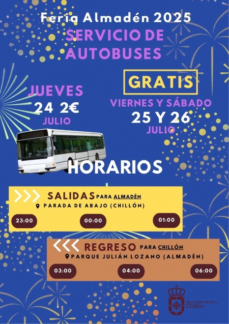 El Ayuntamiento de Chillón informa, que los días 24, 25 y 26 de Julio, contaremos con servicio de bus para ir a la feria de Almadén.