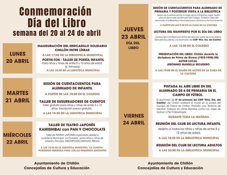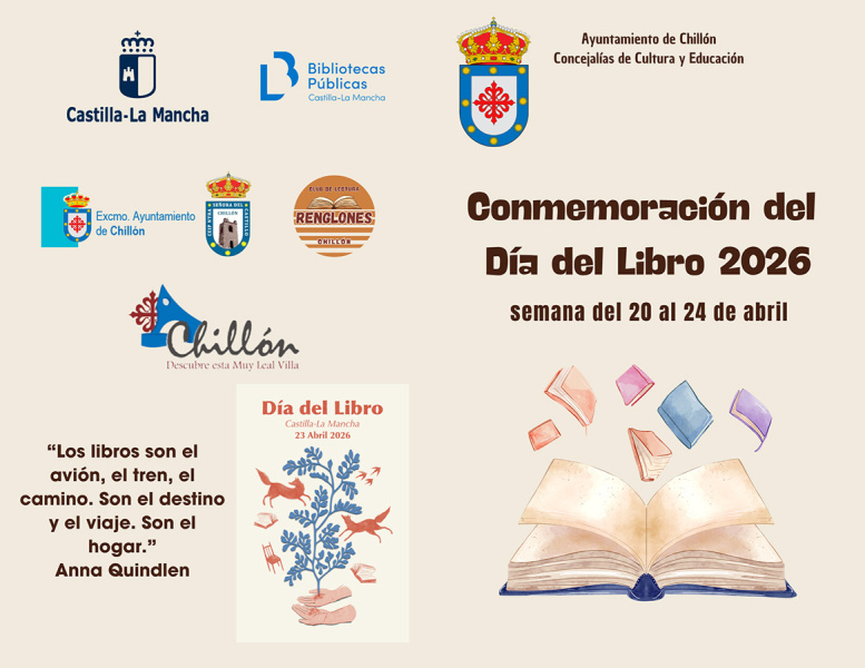 Desde eso Ayuntamiento de Chillón, hemos preparado una programación especial con motivo del Día del Libro, que se celebra el próximo 23 de abril. Durante toda la semana se realizarán diferentes actividades relacionadas con la lectura, dirigidas a todos los públicos y, especialmente, a los más pequeños.