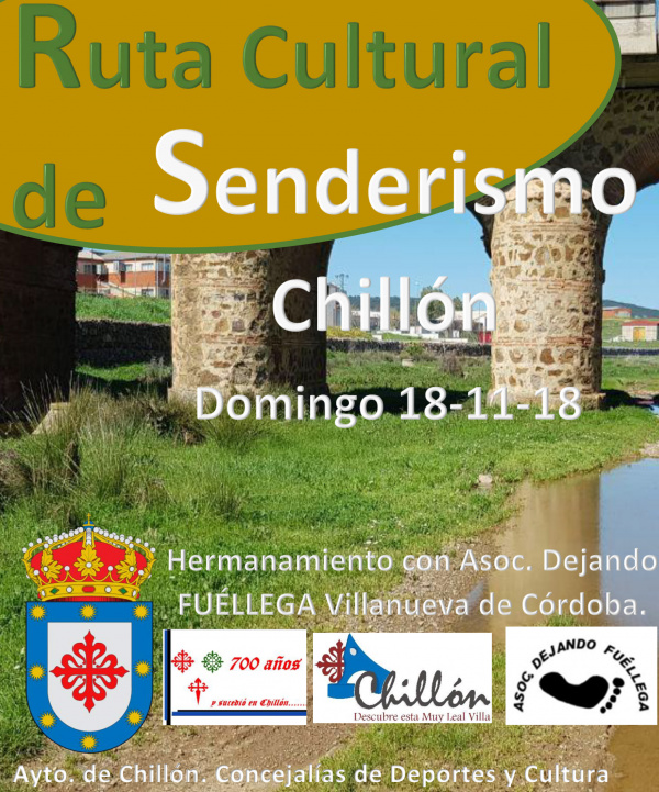 El Excmo. Ayuntamiento de Chillón a través de sus Concejalías de Deportes y Cultura, ha organizado una Ruta Cultural de Senderismo que se desarrollará el domingo día 18 de noviembre próximo.