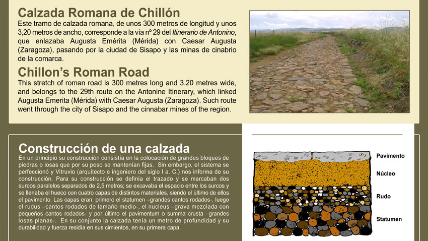 Se corresponden con unos trescientos metros de unos tres metros de ancho correspondientes a la calzada de Mérida a Zaragoza y que pasaba por la ciudad romana de Sisapo según los itinerarios de Antonino. Sisapo hoy día ubicada por los arqueólogos en pleno valle de Alcudia, junto a la pedanía Bienvenida perteneciente al termino de Almodóvar del Campo, dará en tiempos romanos nombre a estas tierras que se conocerán como la región Sisaponense.