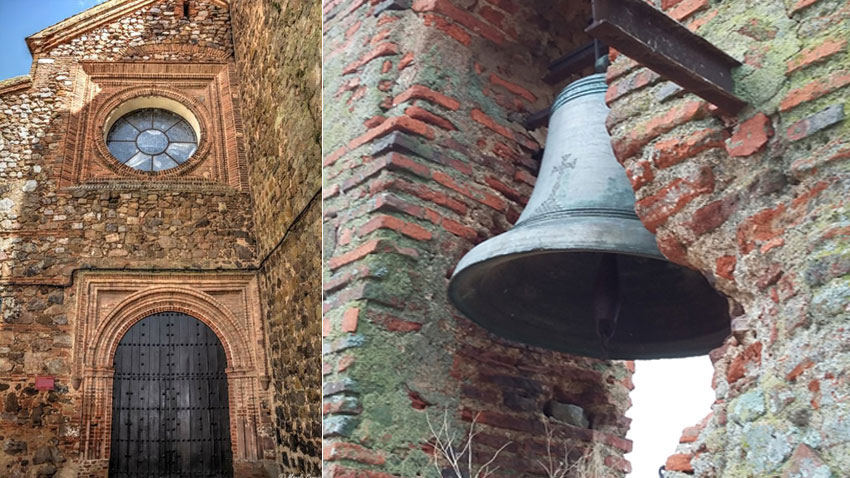En la portada, arco de medio punto, y sobre ella, artística espadaña rematada con frontón triangular.